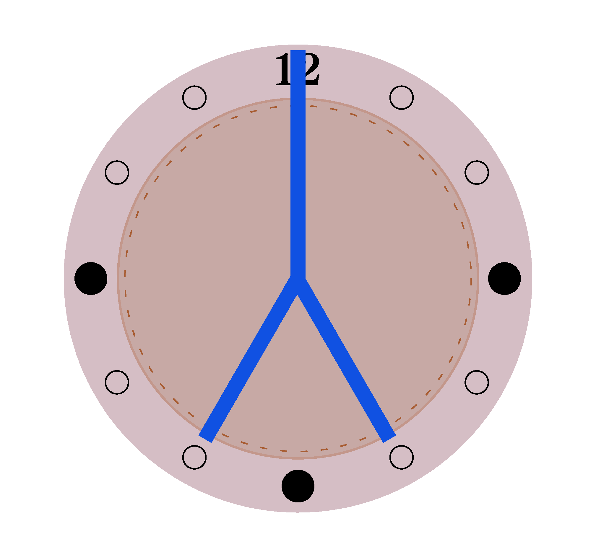 机にある時計の針が、実際に7時25分0秒になると、3本の青い針がどのような形になるだろうか。