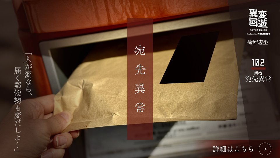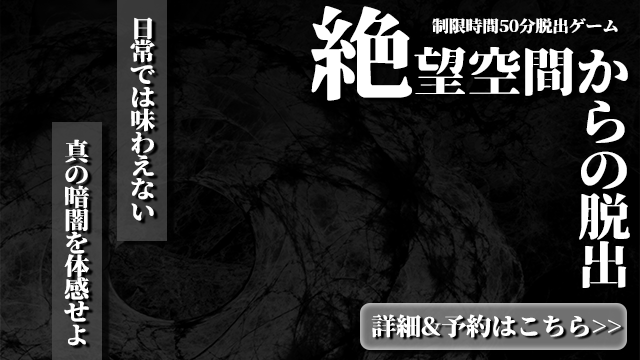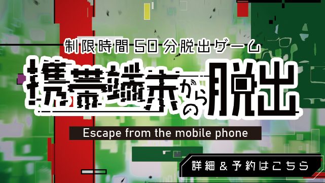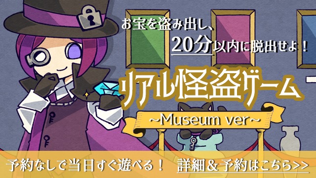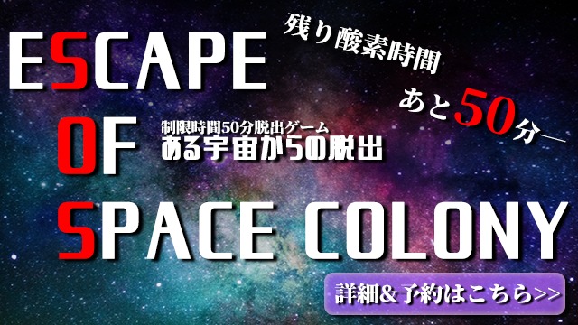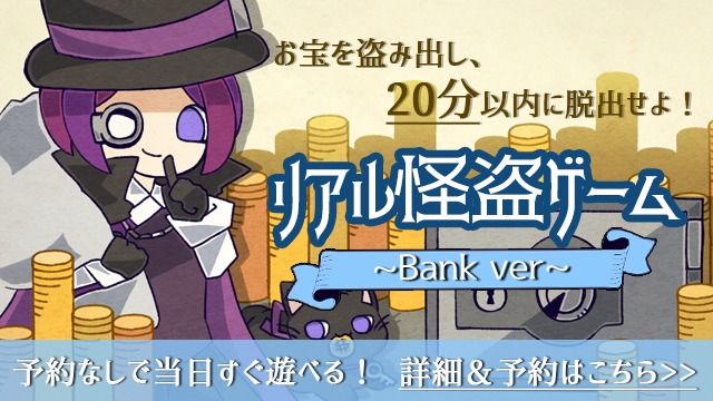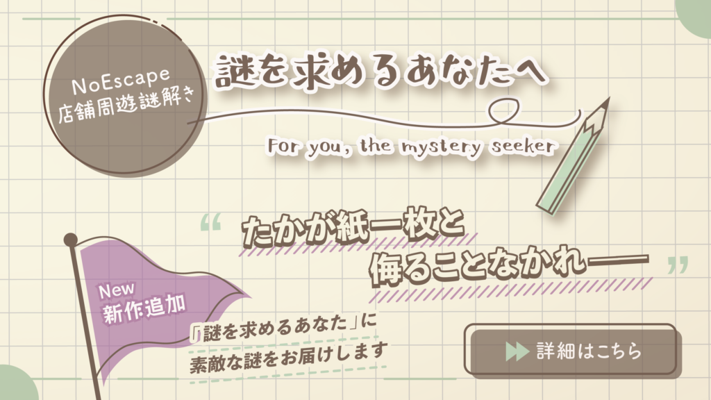 わざを伝える謎解きプロジェクト 形式:ウェブ型謎解きゲーム料金:無料所要時間:初級 約15分 上級 約30分詳細はこちら! 机上監獄デスクレイドルからの脱出 開催地域:東京/池袋開催地:NoEscape池袋店形式:ホール型謎解き公演料金:3,300円/人所要時間:約100分~ 取得注意(池袋周遊謎) 開催地域:東京/池袋開催地:NoEscape池袋店形式:周遊型リアル謎解きゲーム料金:2000円/人所要時間:約90分~ 宛先異常(代々木周遊謎) 開催地域:東京/新宿開催地:NoEscape新宿店形式:周遊型リアル謎解きゲーム料金:2,300円/人所要時間:約120分~ 執事メイと主の手記(代々木周遊謎) 開催地域:東京/新宿開催地:NoEscape新宿店形式:周遊型リアル謎解きゲーム料金:2,000円/人所要時間:約120分~ 少年ルッソとカタられし世界ノ秘密(池袋周遊謎) 開催地域:東京/池袋開催地:NoEscape池袋店形式:周遊型リアル謎解きゲーム料金:2,000円/人所要時間:約120分~ リアル怪盗ゲーム(美術館編) 開催地域:東京/新宿/池袋開催地:NoEscape新宿店・NoEscape池袋店形式:ルーム型リアル謎解き脱出ゲーム料金:1,500円/人所要時間:約20分 リアル怪盗ゲーム(銀行編) 開催地域:東京/池袋開催地:NoEscape池袋店形式:ルーム型リアル謎解き脱出ゲーム料金:1,500円/人所要時間:約20分 謎の研究施設からの脱出 開催地域:東京/池袋開催地:NoEscape池袋店形式:ルーム型リアル謎解き脱出ゲーム料金:1,500円/人所要時間:約20分 謎を求めるあなたへ 開催地域:東京/新宿/池袋開催地:NoEscape新宿店・NoEscape池袋店形式:店舗周遊型リアル謎解きゲーム料金:700円/人所要時間:約30分~ 魔女屋敷からの脱出 開催地域:東京/新宿/池袋開催地:NoEscape新宿店・NoEscape池袋店形式:ルーム型リアル謎解き脱出ゲーム料金:2,700円/人所要時間:約50分 古代遺跡からの脱出 開催地域:東京/池袋開催地:NoEscape池袋店形式:ルーム型リアル謎解き脱出ゲーム料金:2,700円/人所要時間:約50分 崩壊した遺跡からの脱出 開催地域:東京/新宿開催地:NoEscape新宿店形式:ルーム型リアル謎解き脱出ゲーム料金:2,700円/人所要時間:約50分 闇研究所からの脱出 開催地域:東京/新宿開催地:NoEscape新宿店形式:ルーム型リアル謎解き脱出ゲーム料金:2,700円/人所要時間:約50分 絶望空間からの脱出 開催地域:東京/新宿開催地:NoEscape新宿店形式:ルーム型リアル謎解き脱出ゲーム料金:2,700円/人所要時間:約50分 廃病院からの脱出 開催地域:東京/新宿開催地:NoEscape新宿店形式:ルーム型リアル謎解き脱出ゲーム料金:2,700円/人所要時間:約50分 分断された実験室からの脱出 開催地域:東京/新宿開催地:NoEscape新宿店形式:ルーム型リアル謎解き脱出ゲーム料金:3,000円/人所要時間:約50分 危機迫るからくり城からの脱出 開催地域:東京/新宿開催地:NoEscape新宿店形式:ルーム型リアル謎解き脱出ゲーム料金:3,000円/人所要時間:約50分 地下室からの脱出 開催地域:東京/池袋開催地:NoEscape池袋店形式:ルーム型リアル謎解き脱出ゲーム料金:2,700円/人所要時間:約50分 携帯端末からの脱出 開催地域:東京/池袋開催地:NoEscape池袋店形式:ルーム型リアル謎解き脱出ゲーム料金:2,700円/人所要時間:約50分 ある宇宙からの脱出 開催地域:東京/池袋開催地:NoEscape池袋店形式:ルーム型リアル謎解き脱出ゲーム料金:2,700円/人所要時間:約50分 海賊王が遺した部屋からの脱出 開催地域:東京/池袋開催地:NoEscape池袋店形式:ルーム型リアル謎解き脱出ゲーム料金:2,700円/人所要時間:約50分 人類選別計画からの脱出 開催地域:東京/池袋開催地:NoEscape池袋店形式:ルーム型リアル謎解き脱出ゲーム料金:2,700円/人所要時間:約50分 不思議の国の女王からの脱出 開催地域:東京/池袋開催地:NoEscape池袋店形式:ルーム型リアル謎解き脱出ゲーム料金:3,000円/人所要時間:約50分 ワインセラーからの脱出 開催地域:東京/池袋開催地:NoEscape池袋店形式:ルーム型リアル謎解き脱出ゲーム料金:3,000円/人所要時間:約50分 地下牢獄からの脱出 開催地域:東京/池袋開催地:NoEscape池袋店形式:ルーム型リアル謎解き脱出ゲーム料金:3,000円/人所要時間:約50分 果て無く白き部屋からの脱出 開催地域:東京/池袋開催地:NoEscape池袋店形式:ルーム型リアル謎解き脱出ゲーム料金:3,000円/人所要時間:約50分 夜駆ける寝台特急からの脱出 開催地域:東京/池袋開催地:NoEscape池袋店形式:ルーム型リアル謎解き脱出ゲーム料金:2,700円/人所要時間:約50分